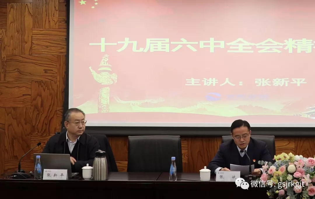 為深入學習貫徹黨的十九屆六中全會精神, 11月30日上午,甘肅金控集團邀請蘭州大學馬克思主義學院張新平教授,舉辦十九屆六中全會精神專題輔導講座。集團黨委書記、董事長祁建邦及在家班子成員參加講座。集團黨委副書記、工會主席張斌主持并講話。