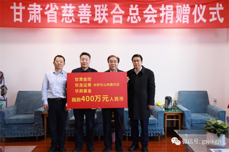 12月21日,甘肅金控集團、華龍證券及華商基金通過甘肅省慈善聯合總會,向積石山地震災區捐款400萬元,全力支持抗震救災工作。