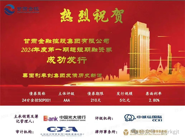 1月26日,甘肅金控集團成功發行2024年度第一期超短期融資券,發行規模5億元,債券期限210天,票面利率2.80%,再創發行債券融資利率新低。