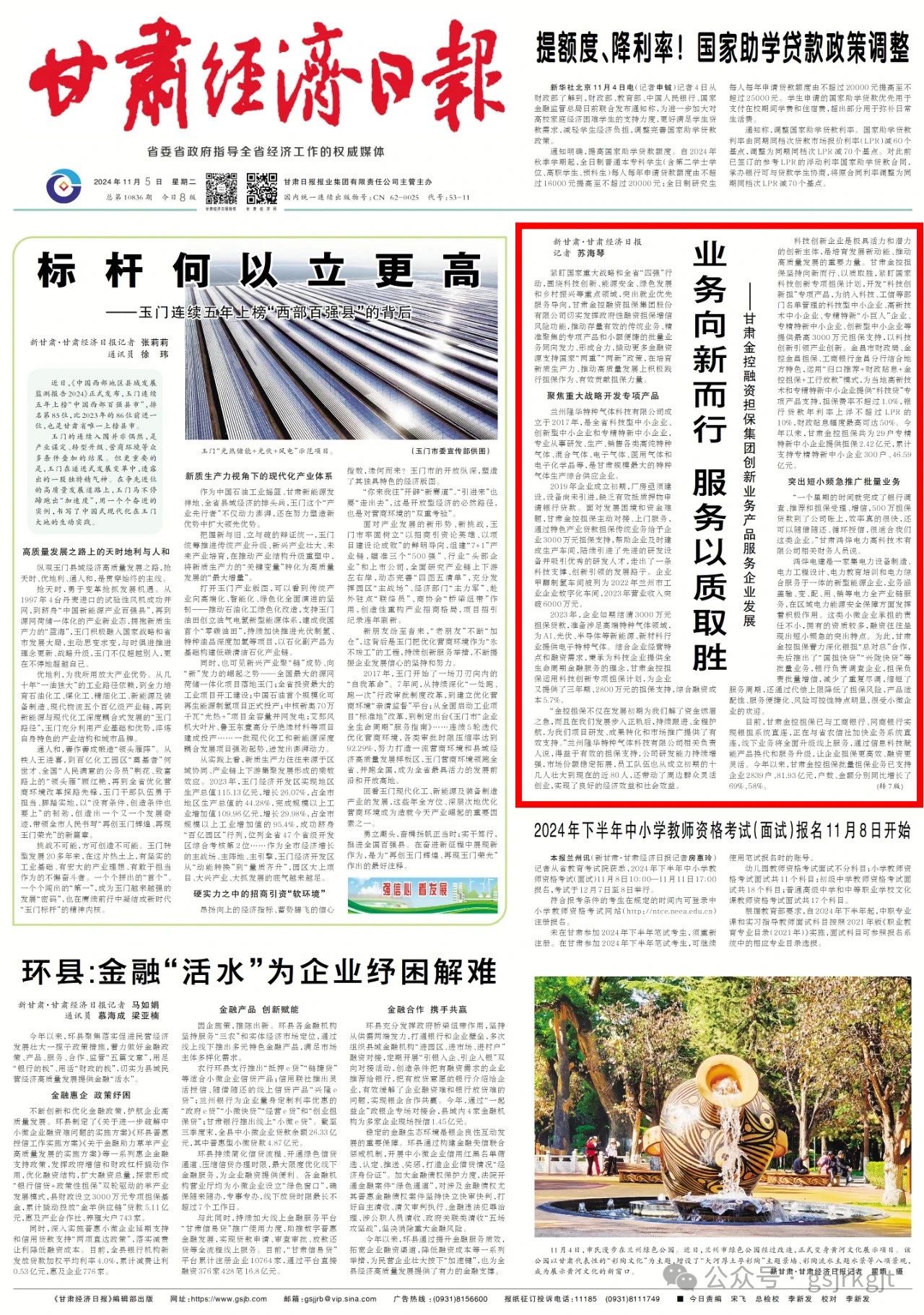 其實,除了“科技創(chuàng)新?lián)睂m棶a(chǎn)品外,甘肅金控擔保“設備擔”專項產(chǎn)品,最高擔保額度3000萬元,平均擔保費率1%,重點為工業(yè)、交通、農(nóng)業(yè)等全省7大領域符合條件的中小企業(yè)提供擔保支持,幫助企業(yè)設備更新和技術(shù)改造,助力傳統(tǒng)產(chǎn)業(yè)煥新升級、新興產(chǎn)業(yè)蓬勃壯大,帶動擴大有效投資和市場消費,已為蘭州新區(qū)、酒泉等地企業(yè)提供擔保3000多萬元。“園區(qū)擔”專項產(chǎn)品細則正在加快完善,按照“資源共享、風險共擔、優(yōu)勢互補”原則,由園區(qū)、銀行、擔保協(xié)同推進,分層分類滿足園區(qū)內(nèi)初創(chuàng)期、成長期及成熟期企業(yè)差異化擔保需求。“鄉(xiāng)村振興擔”專項產(chǎn)品已為71戶企業(yè)提供擔保2.7億元,助力鄉(xiāng)村產(chǎn)業(yè)發(fā)展和鄉(xiāng)村設施建設,帶動更多農(nóng)戶穩(wěn)定就業(yè)和增收致富。