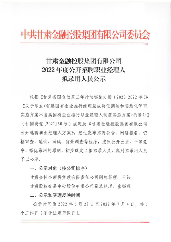 甘肅金融控股集團有限公司2022年度公開招聘職業經理人擬錄用人員公示