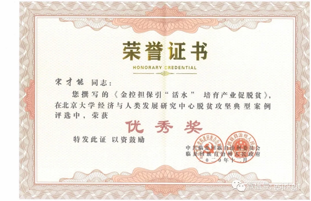 近期,臨夏州脫貧攻堅典型案例評選活動落下帷幕,金控臨夏擔(dān)保推薦的《金控?fù)?dān)保引活水,培育產(chǎn)業(yè)促脫貧》典型案例經(jīng)北京大學(xué)課題組與臨夏州委宣傳部、州扶貧辦、州文聯(lián)、民族日報社多輪篩選評審,在北京大學(xué)經(jīng)濟與人類社會發(fā)展研究中心脫貧攻堅典型案例評選中榮獲優(yōu)秀獎,得到州委州政府表彰。