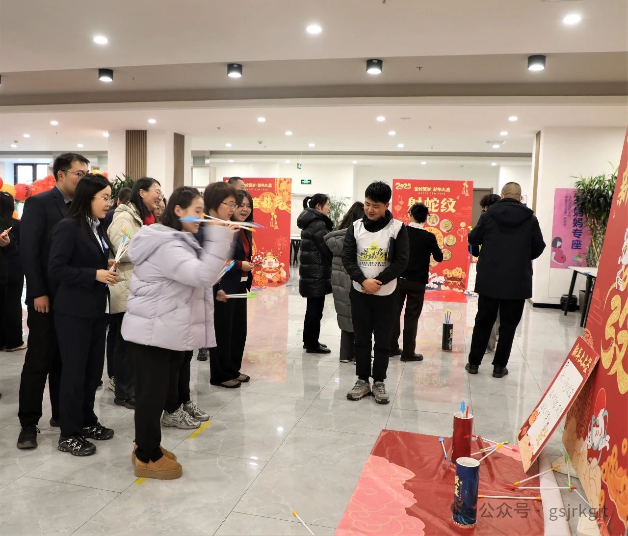 隨著鏗鏘有力的鑼鼓聲,兩只威武靈動的“祥瑞金獅”躍入會場,拉開活動序幕,在舞獅隊員輾轉騰挪間,集團公司領導執筆點睛,寓意新年開新局。隨后開展的“古韻新潮”游戲區人聲鼎沸,投壺游戲中的“上上簽”破空聲與歡呼聲此起彼伏,“射箭”靶場選手凝神靜氣“百步穿楊”,“釣魚”現場錦鱗翻飛笑鬧如潮,套圈環節精準拋擲歡呼雀躍,冰壺賽道上更是上演“智謀對決”,團隊協作的默契充分展現。現場氣氛熱烈,歡笑與掌聲交織出歡樂的海洋。